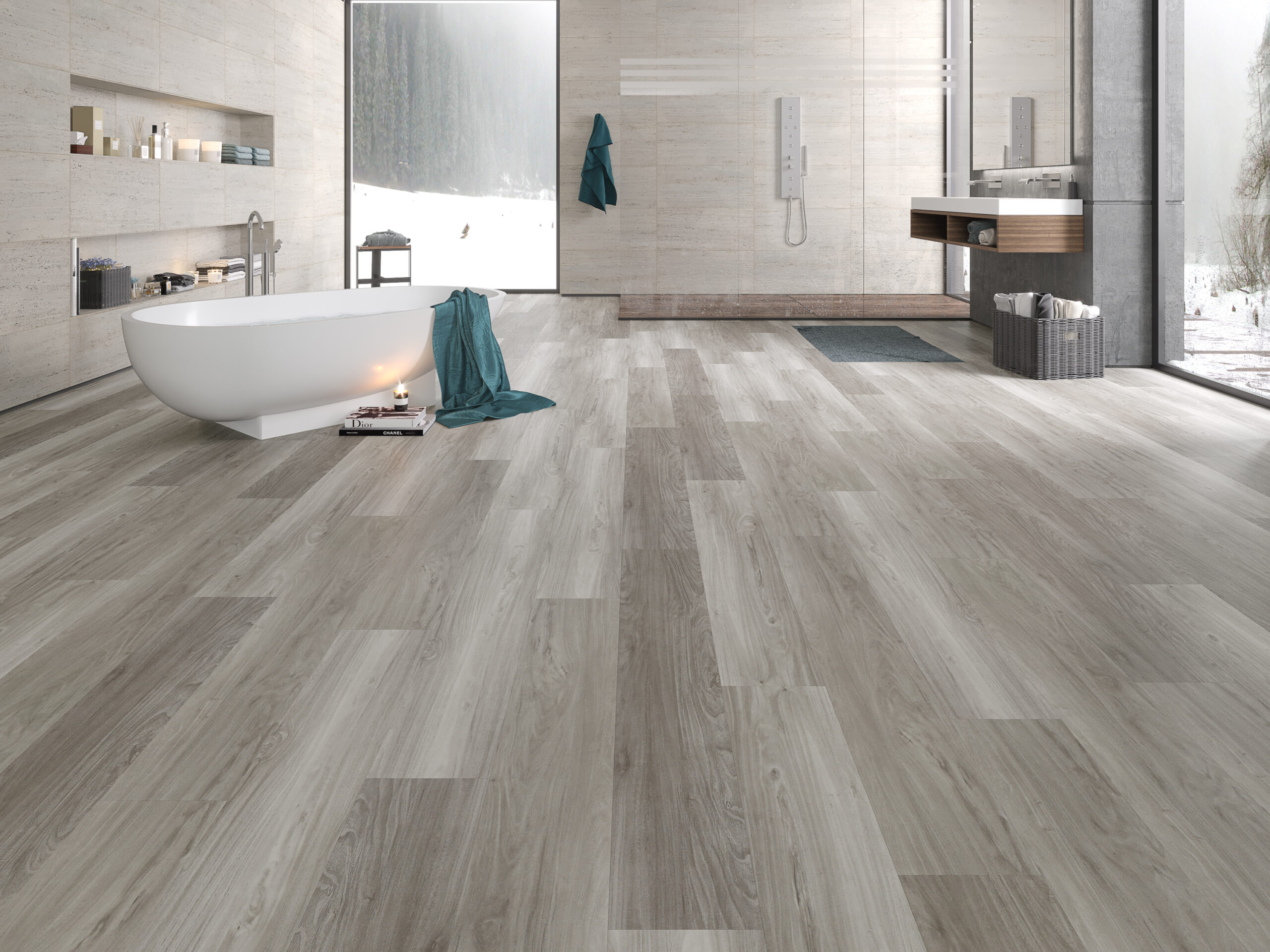 Luxury Vinyl Flooring, 48″(1220mm) x 7″(178mm) x 0.217″(5.5mm) 22mil + CERAMIC BEAD overlay included 1.5mm W23 EVA underlayment attached, Unilin click, embossed surface, virgin material, 10 planks /box, 23.4 sqft/box – 55 Boxes/ pallet.